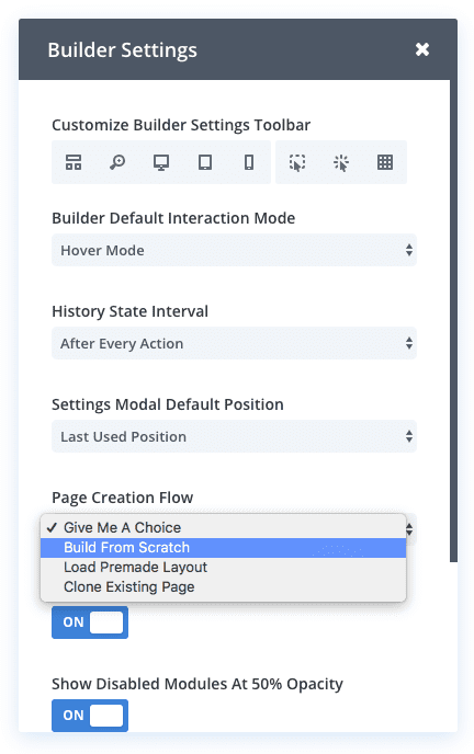 This new page creation workflow is completely optional, and you can even customize your desired default pathway within the Visual Builder interface settings. If you want to bypass the choice altogether, you choose to jump straight into either of the three options whenever the Visual Builder is loaded. If you want the builder to work just like it does now, simply choose Start From Scratch as your default page creation option. If you find yourself often loading layouts when you create new pages, you can choose “Load Premade Layout” as your default pathway. Every time you launch the Visual Builder, you will jump straight to the library and you can work from there.