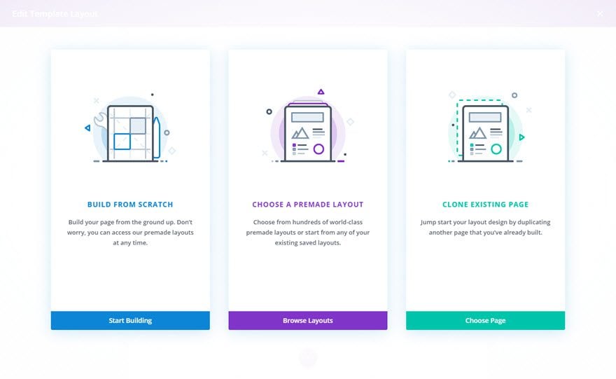 Much like you would when designing a page in Divi, you are prompted to choose how you would like to start building the layout. For example, you could jump start the design with a premade layout or a header layout you previously designed by selecting the option “Choose a Premade Layout”. However if you want to build the header from scratch, select “Build From Scratch”.