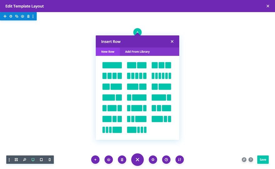NOTE: You can also choose to add one of our premade layouts to the footer template editor to jumpstart the design of your footer. You can do this at any time by clicking the Add from Library plus icon in the settings menu at the bottom of the editor.