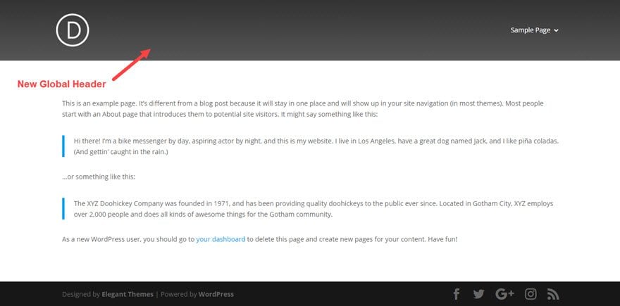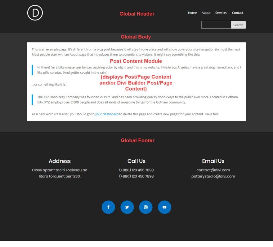 Once you have a Global Header, Body, and Footer in place, a sample page would look something like this.