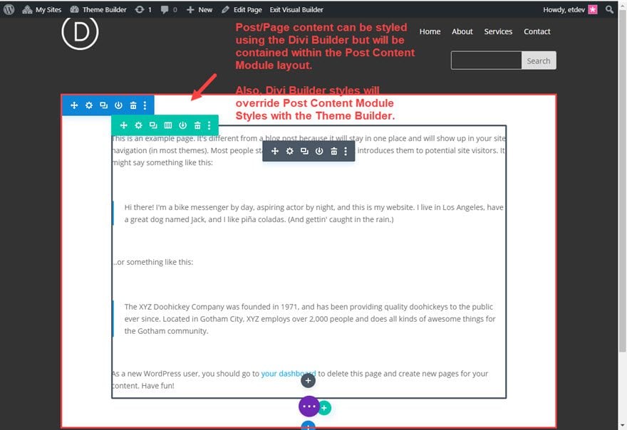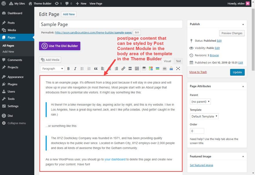 This post content module is essentially a placeholder for the content that is added to the content of a page in Divi. If you are not using Divi Builder on a page, the post content module will display the content within the WYSIWYG editor of a page or post on the backend.