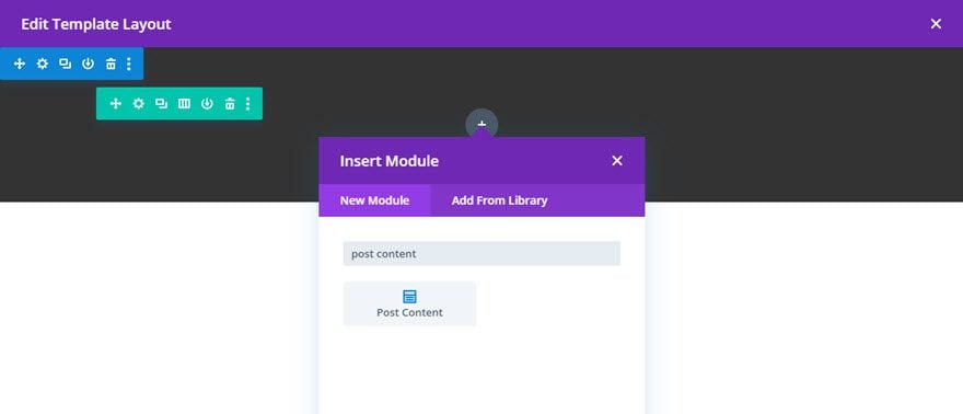 When adding a custom template area to your new template, you may choose to add a layout from your Divi library. This functionality mimics the process of adding a new layout to your page when using the Divi Builder. To add a layout to the template area from the library, click the template area and select Add from Library. The add from library popup will appear where you can choose any premade, saved, or existing page layouts. Once the layout has been added to the template area, you can select the gear icon to edit the layout using the Divi Builder within the Template Layout Editor.