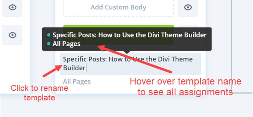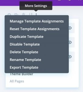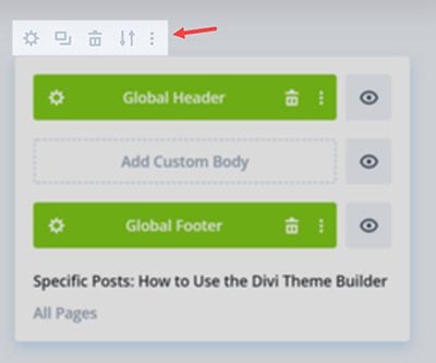 When hovering over a template within the theme builder, a template settings menu will appear at the top left of the template box. This menu is very similar to the menus you see when hovering over a section, row, or module within the Divi Builder.