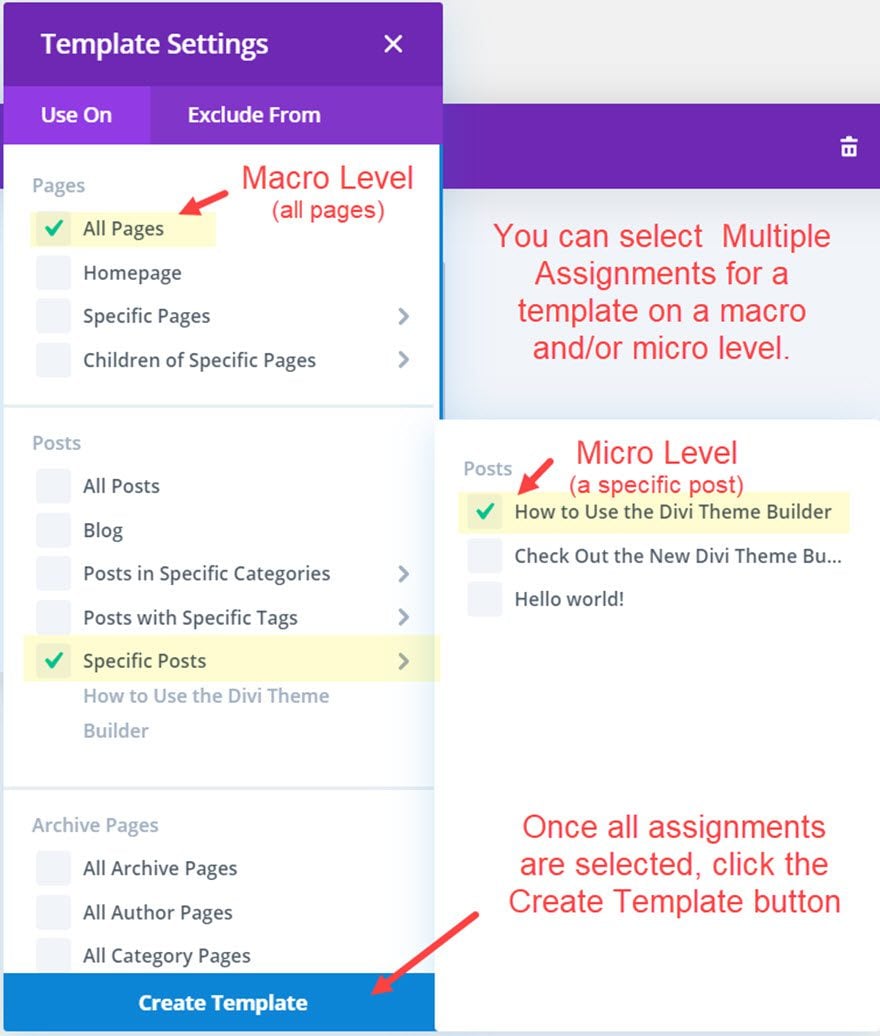 Templates can be assigned on a macro level and/or micro level. For example, you may choose to assign the template to all pages throughout your site (macro level), or you may choose to assign the template to one specific post (micro level). Or both! You can even select multiple assignments, giving you complete control over where you would like your template assigned throughout you website.