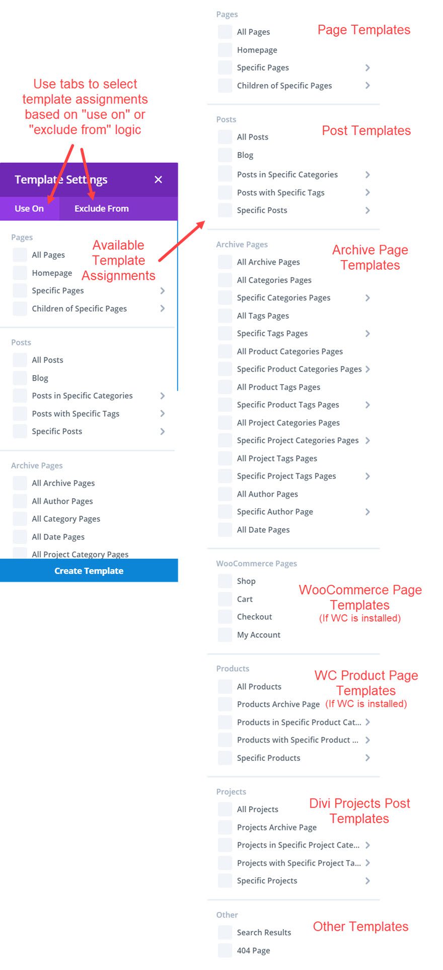The template assignments can be selected under the “Use on” tab and the “Exclude From” tab. It is up to you whether or not you want to base your assignments on the “Use on” logic or the “Exclude From” logic. But feel free to use a combination of both if needed.