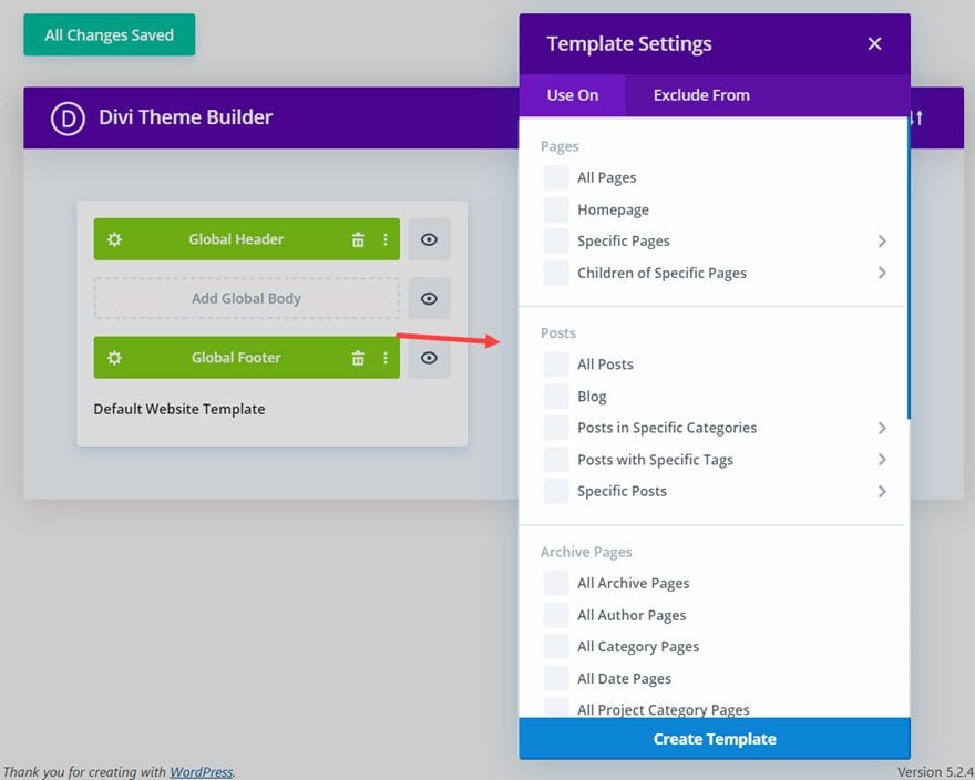 This will bring up the Template Settings modal that prompts you to manage the template assignments. In other words, you will need to designate on what pages or posts you want to assign the template. More on this below.