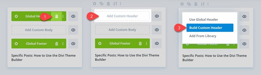 - You can delete the Global Header and build the Custom header from scratch for the template or add one from the Library.