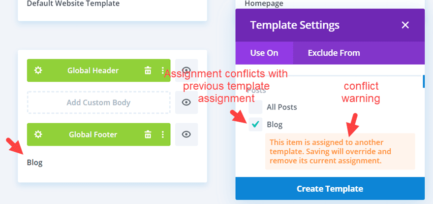 NOTE: If an include selection conflicts with an exclude selection, the exclude selection always overrides the include. For example, if you choose to “Include on Homepage” and “Exclude from Homepage”, this template will be excluded from the Homepage.