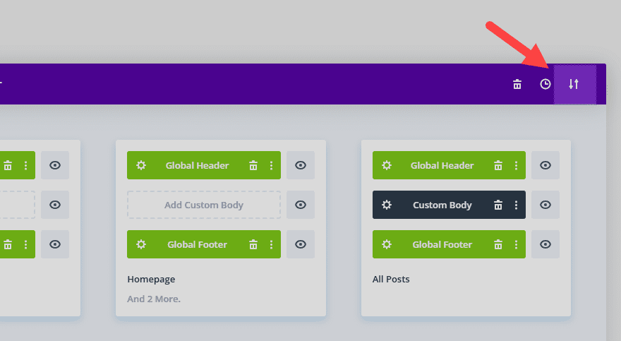 To access the Theme Builder Portability option, click the portability icon on the right of the purple bar at the top of the Theme Builder interface.
