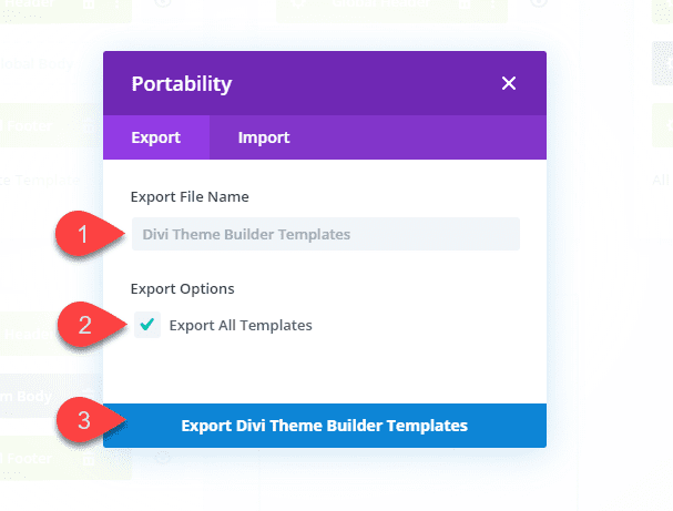 The portability modal will popup with the export tab open by default. Give the export file a name, update the export option (if needed), and click to export the file. If you leave the export option to export all templates, all the theme templates will be exported in the file.
