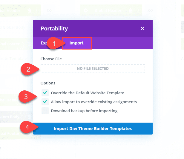 To import a theme builder template json file to your website, you will need to deploy the portability modal and select the import tab. Select the file you’d like to import, update the override options (if needed), and click to import the file.