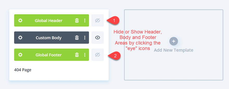 In addition to being able to customize each area of a template, you can also toggle an area’s visibility to either show or hide it on the Front End by clicking the “eye” icon next to each area. For example, you could hide the Header Area and Footer Area of your 404 Page.
