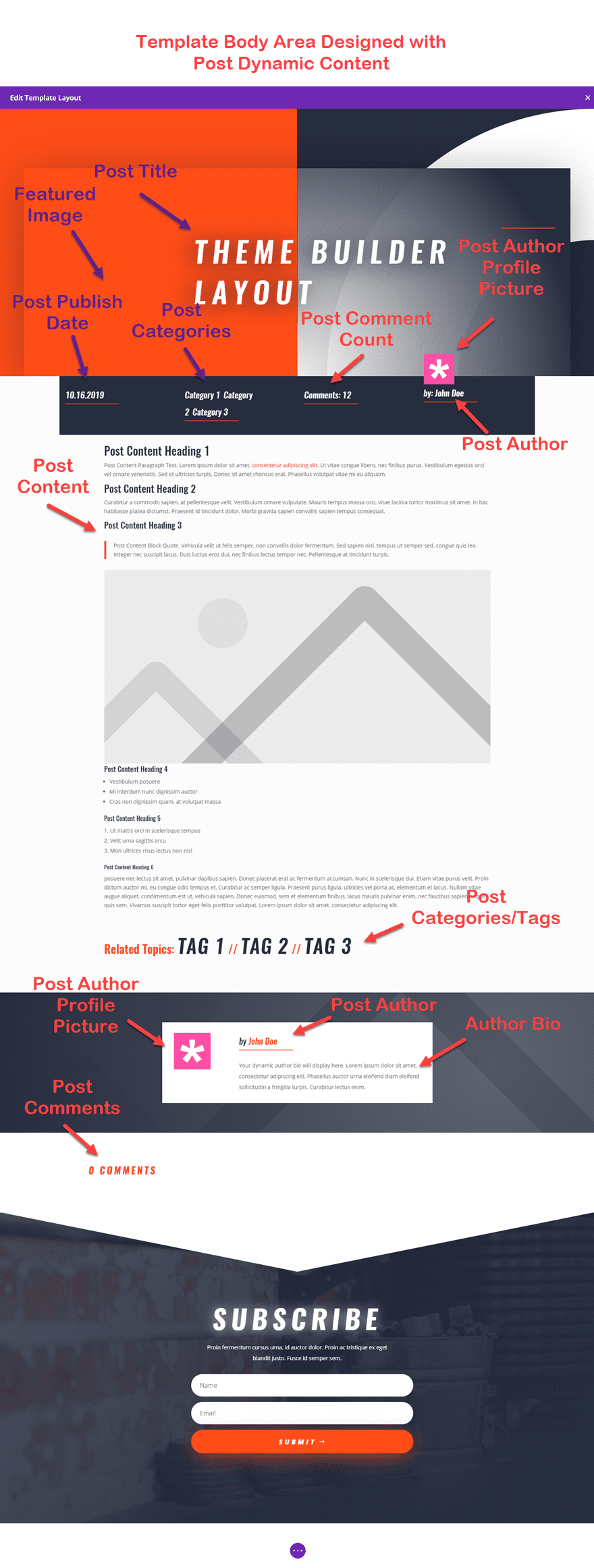 Here is an illustration of an entire layout for a blog post template using dynamic content: