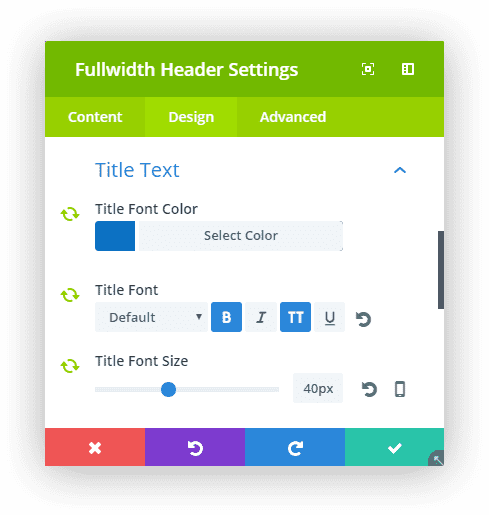 Let’s say you have a Fullwidth Header module at the top of all of your pages. This is quite common. Each header module has a different title in the “Content” tab to represent the current page. You have also edited the options in the “Design” tab to give your header a unique look by adjusting the title font color to blue, title font style to Bold & All Caps, and title font size to 40px. You want all of you header modules on each page to use this unique style, but you need each page to have unique titles. In this case, you can create a Global Fullwidth Header module and choose to selectively sync only those options (font color, font style, and font size).