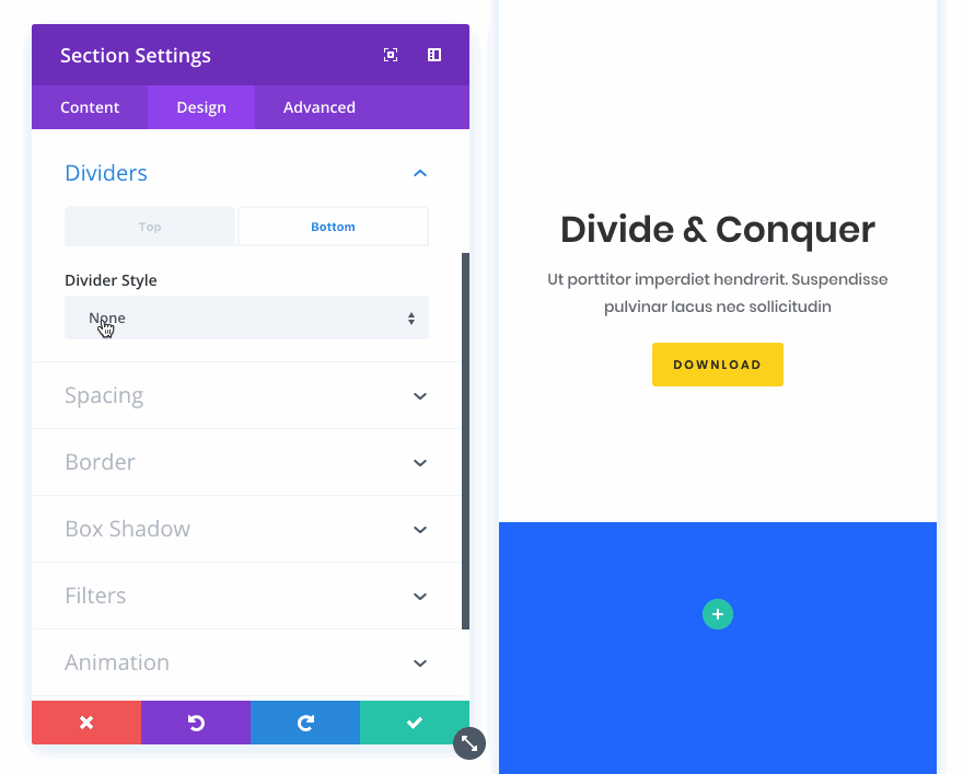 Divi’s Shape Dividers are super easy to use thanks to automatic color inheritance. When a new divider shape is added, it will automatically take on the color of your current section and the adjacent section, creating a seamless transition between the two without requiring you to customize the colors. When you move the section or adjust your section’s background colors, the divider color will update automatically.